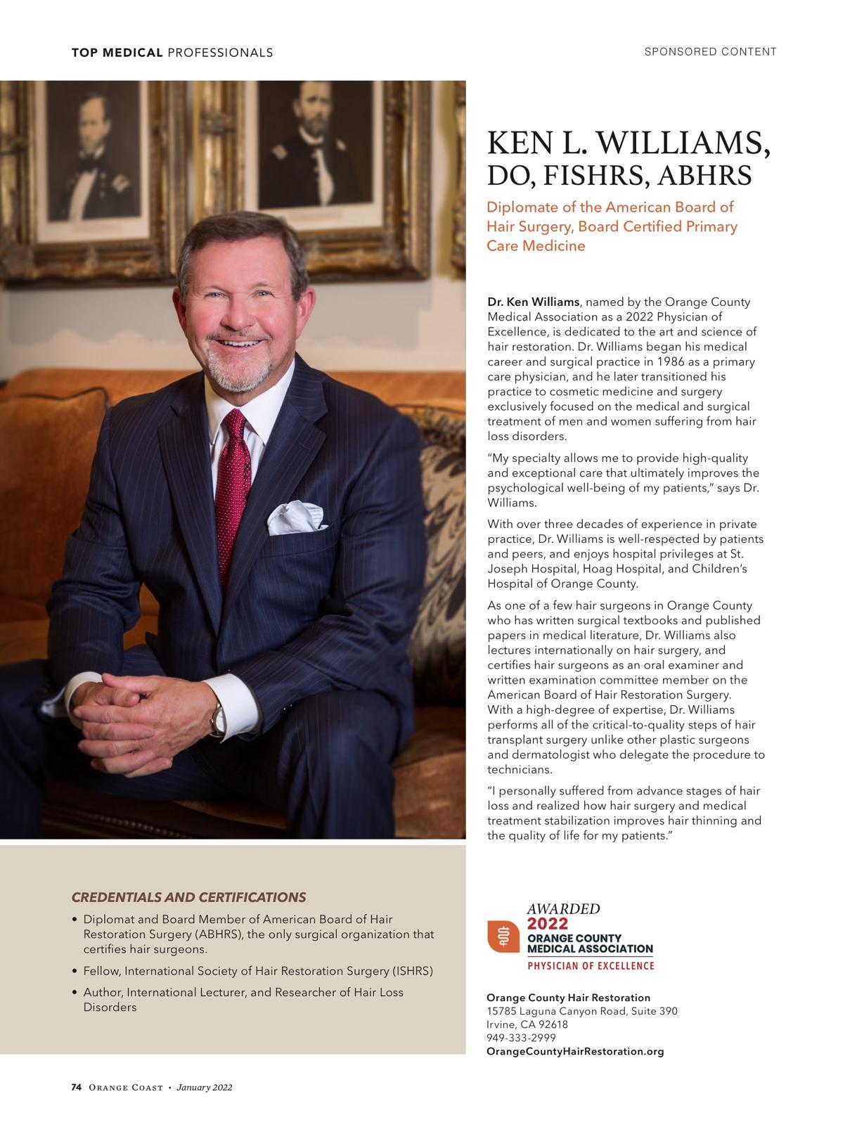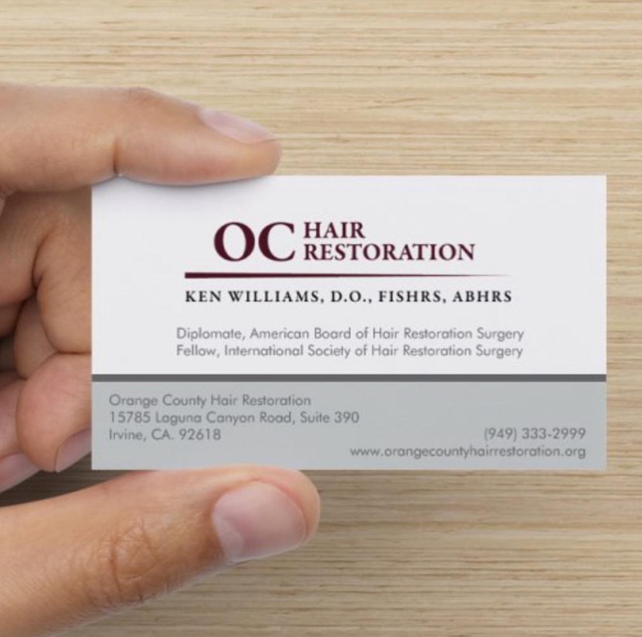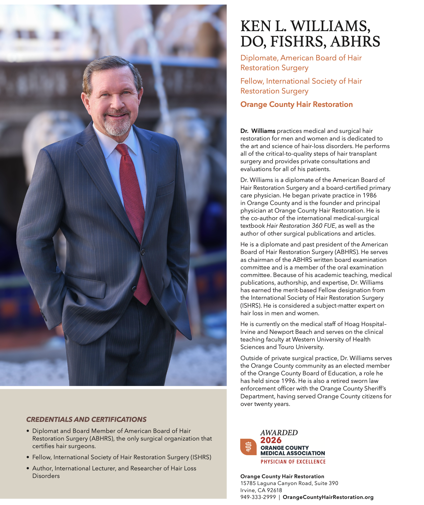 Orange County Hair Restoration with our principal surgeon, Dr. Ken Williams, is a private hair restoration office located in Orange County, Irvine, CA., along the Newport and Laguna Beach Coasts. Our office provides medical and surgical care for hair losss patients, and we specialize in FUE hair transplantation. Our office provides expertise from a American Board of Hair Restoration Surgery (ABHRS) Diplomate and board certified hair surgeon. We understand the importance of natural-looking results by an internationally recognized hair transplant surgeon-Dr. Williams. For a medical or surgical consultation, and/or to determine if you are a candidate for hair restoration, contact our office at 949-333-2999.